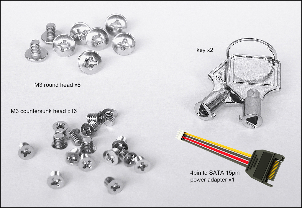 key x2, Mini 4pin to SATA adapter x1