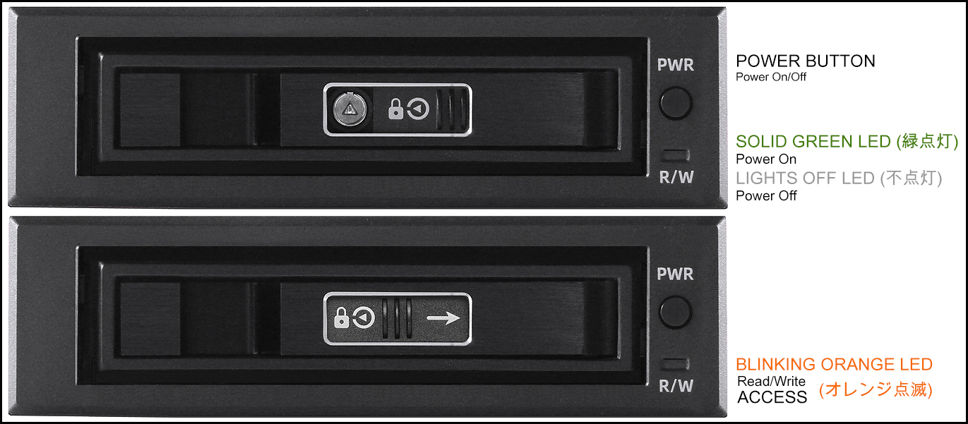 * 2 SSD LED、各LEDが二色あり、緑が電力信号LED、オレンジ色がアクセス信号LED